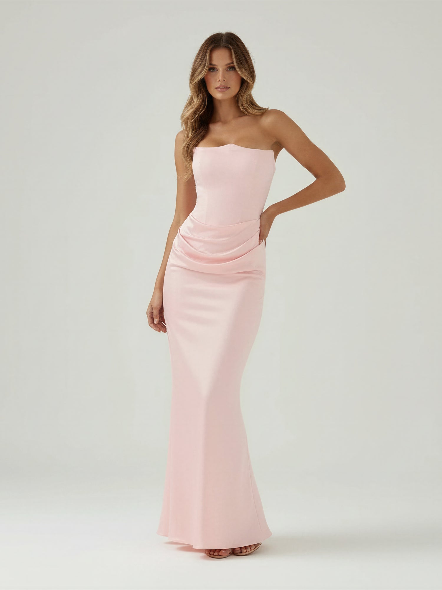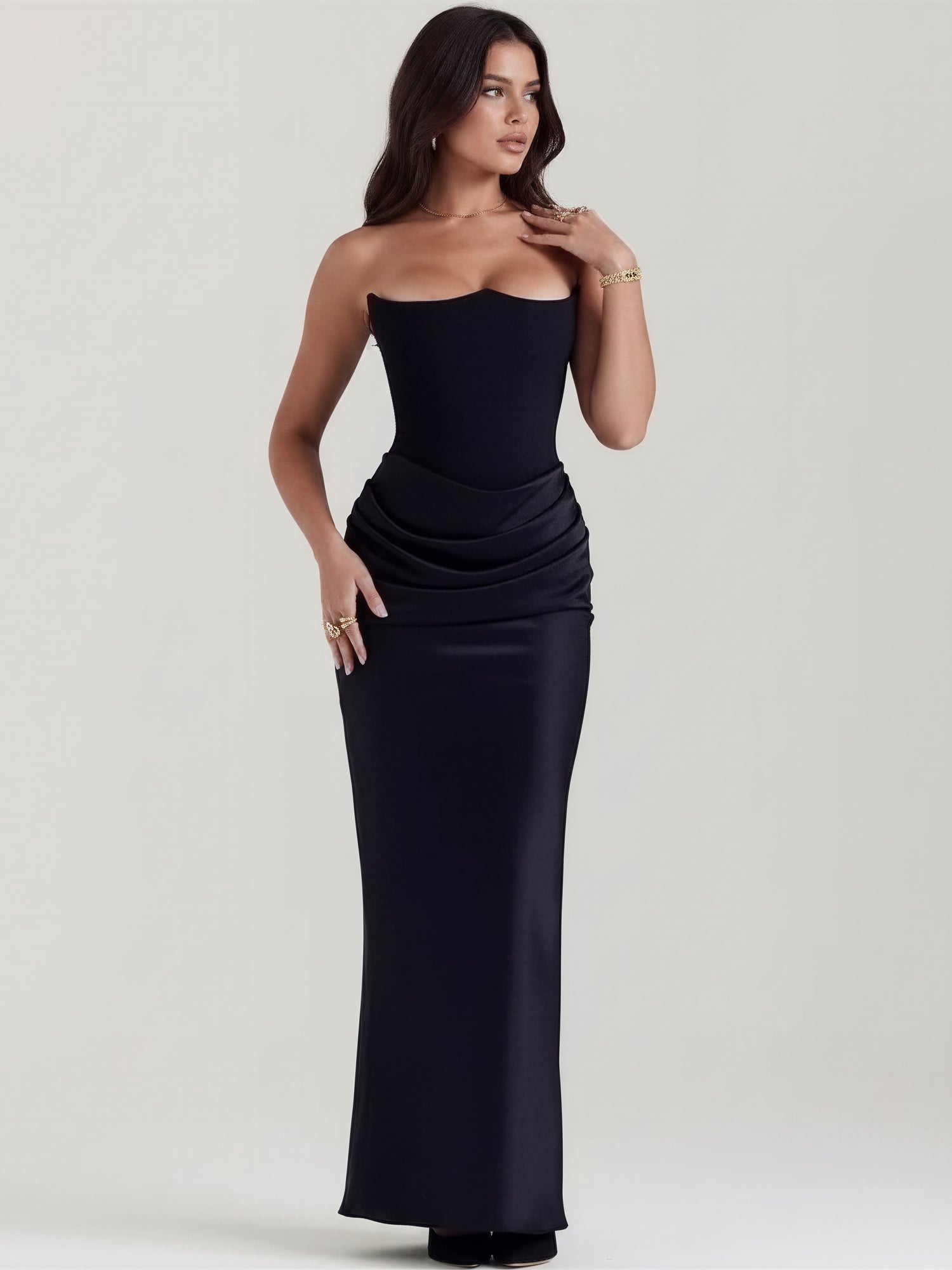 Make an unforgettable impression in this satin maxi dress — a statement of refined elegance and effortless allure. The sculpted bodice enhances your natural shape, while the draped satin detailing adds soft movement and a luxurious sheen. Designed to flatter from every angle, it captures timeless sophistication perfect for galas, weddings, or evening events.