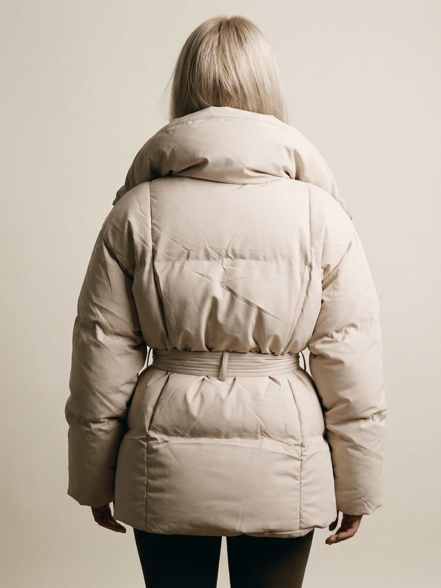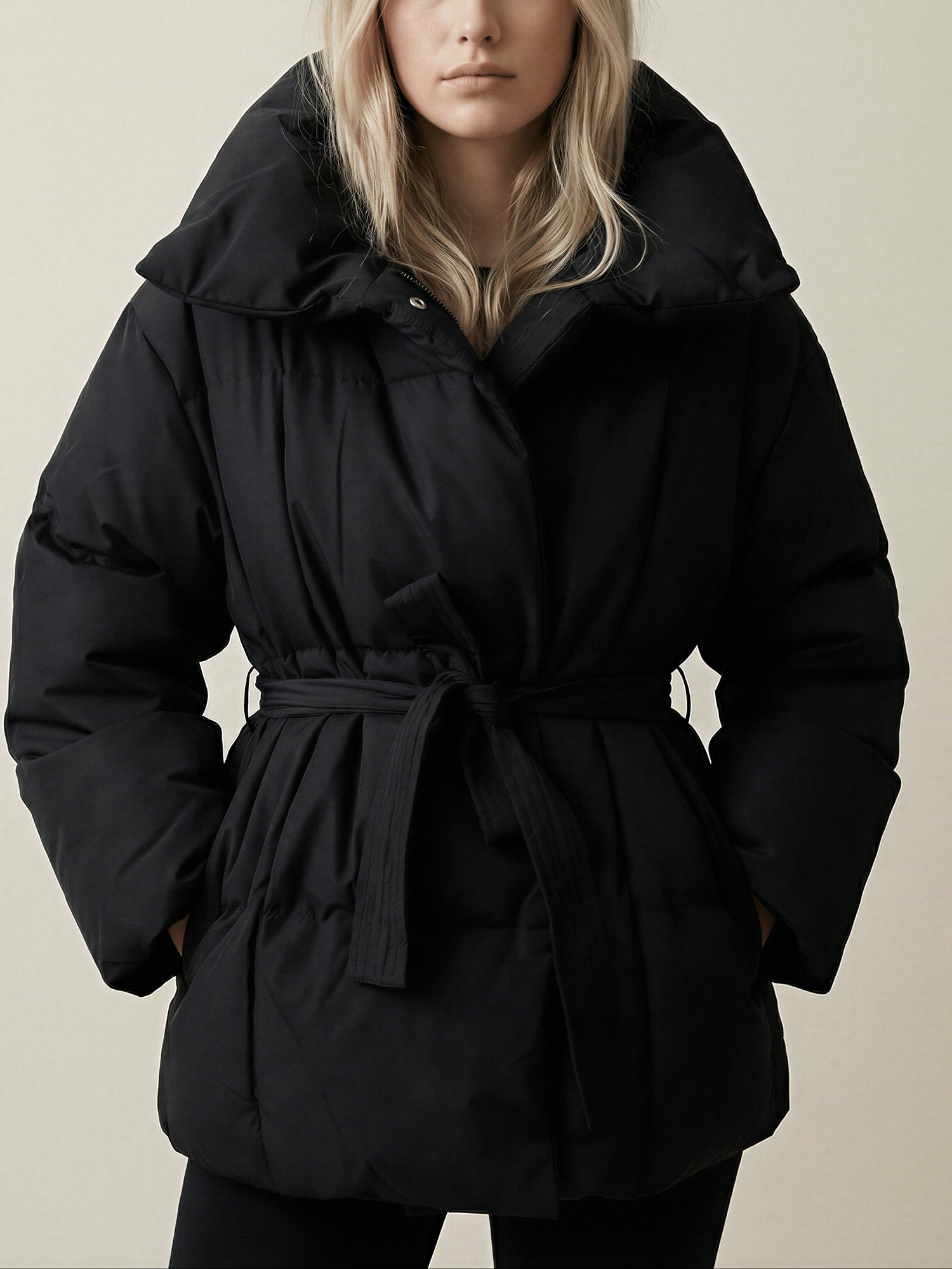 A softly structured puffer jacket designed to balance warmth with refined minimalism. The voluminous collar frames the neckline while the adjustable waist belt defines the silhouette for a flattering, contemporary shape. Lightweight yet insulating, this piece transitions effortlessly from crisp city mornings to relaxed winter layering, offering comfort without compromising style.