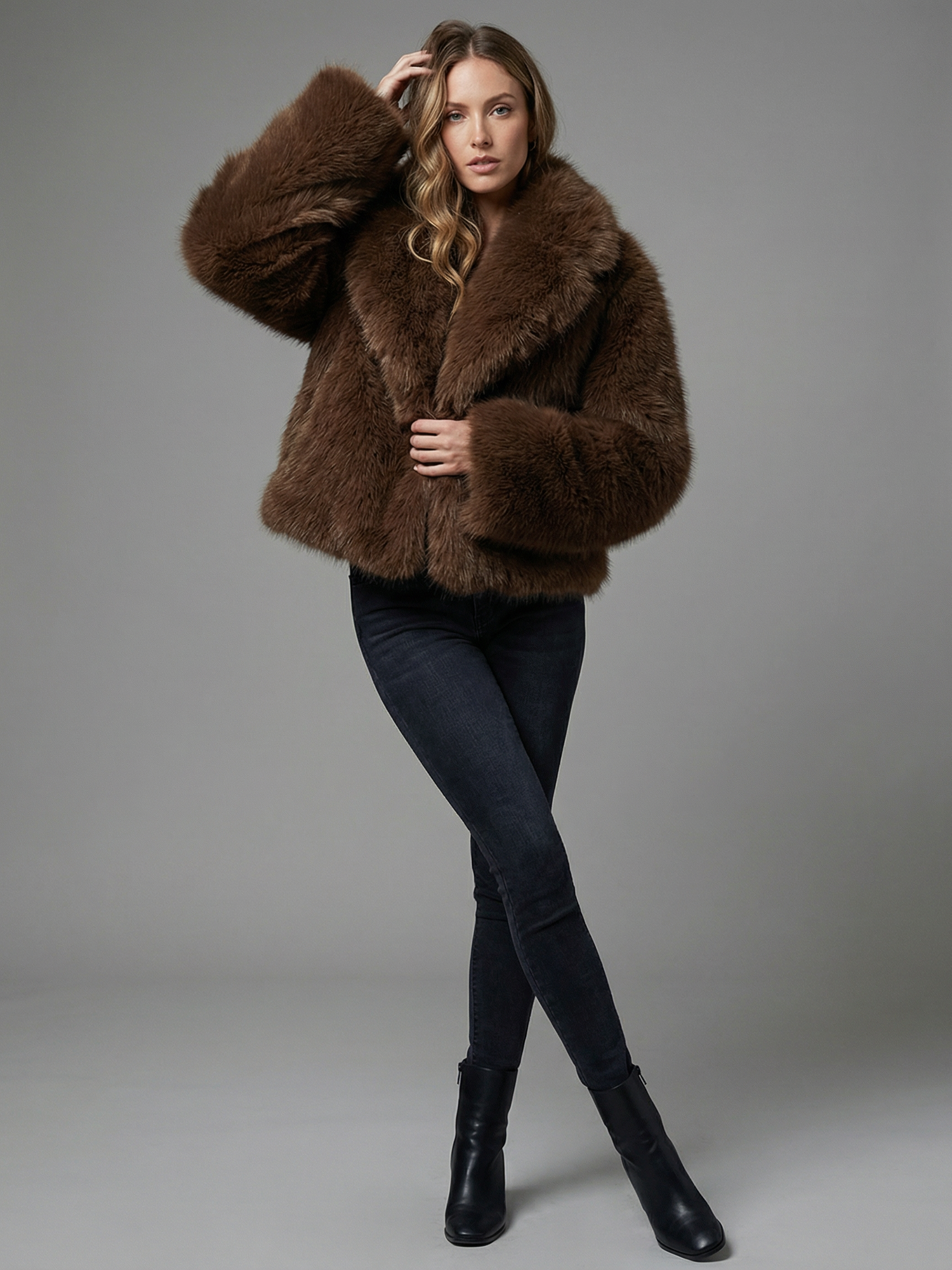 A statement faux fur jacket designed with a plush, full-bodied texture and a clean, cropped silhouette. The structured shoulders and softly rounded shape create a bold yet refined profile, while the rich finish adds instant polish to both casual denim and elevated evening looks. Effortlessly warm without feeling heavy, this piece delivers modern glamour with a timeless edge.