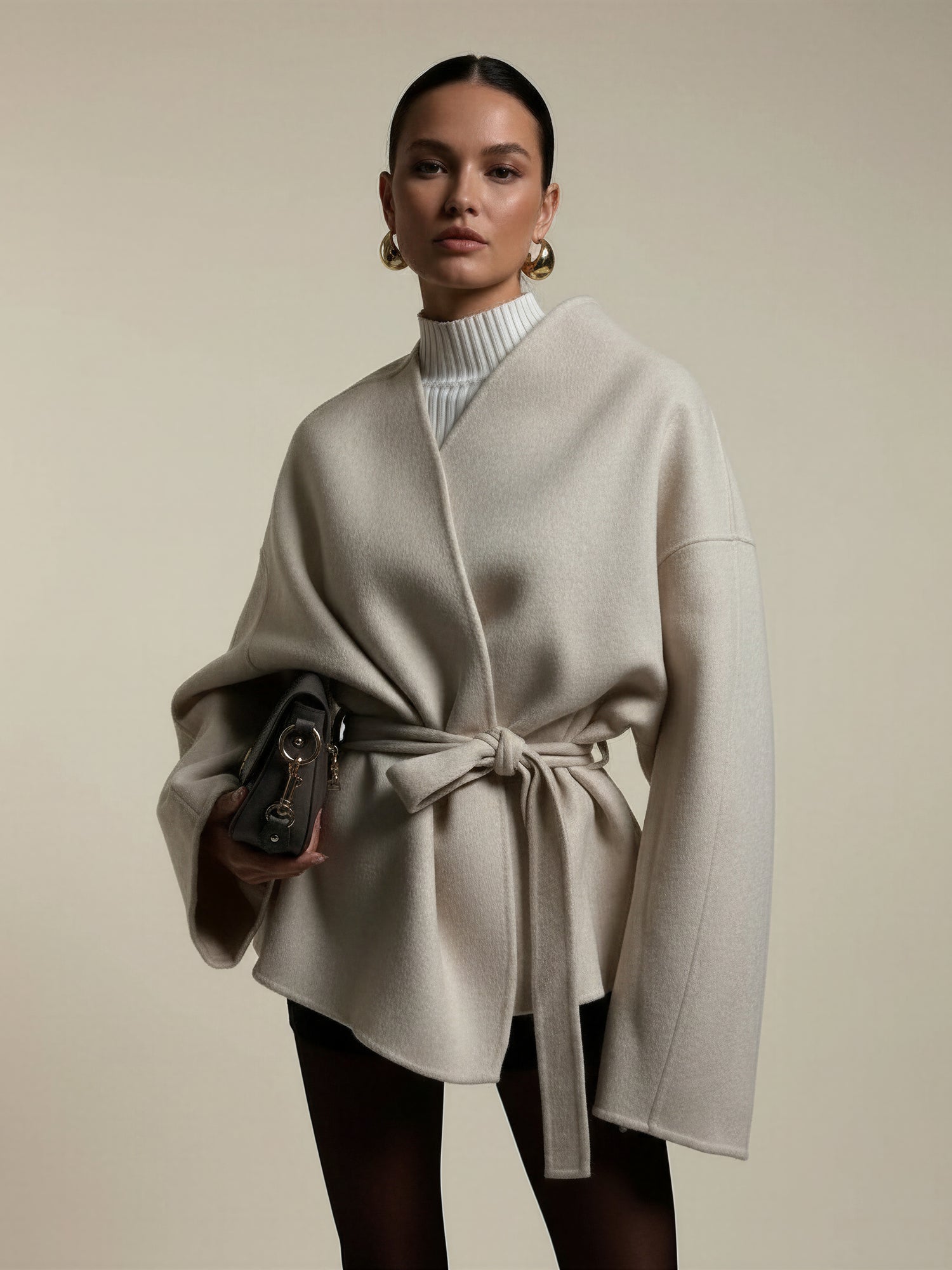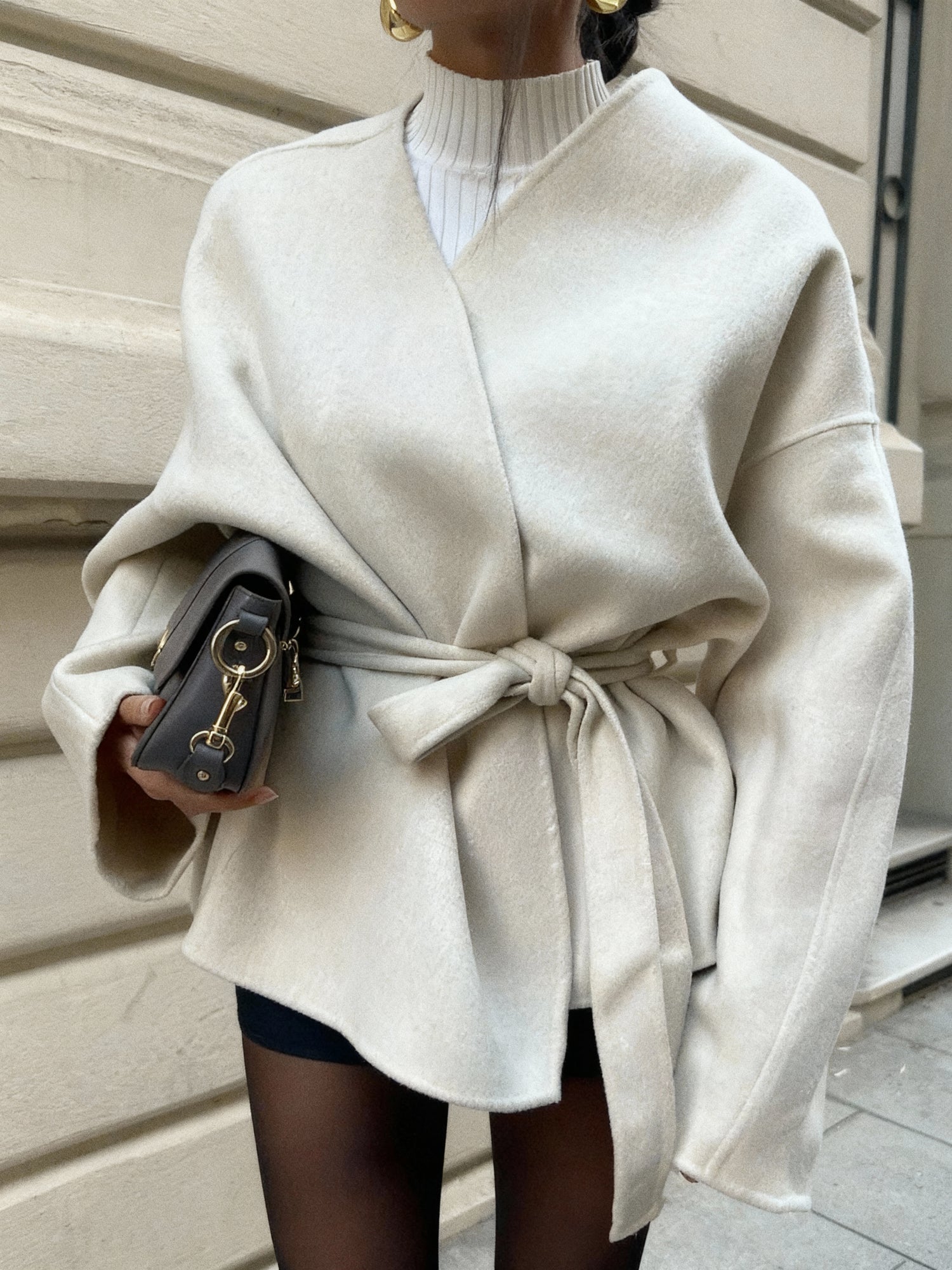 A beautifully structured statement piece, this soft faux-wool wrap coat brings refined simplicity to any outfit. The relaxed V-neck design paired with the adjustable waist tie creates a flattering, sculpted silhouette that feels both effortless and elevated. Perfect for autumn strolls, winter layering, and polished everyday style, it captures that timeless old-money charm with a modern twist.
