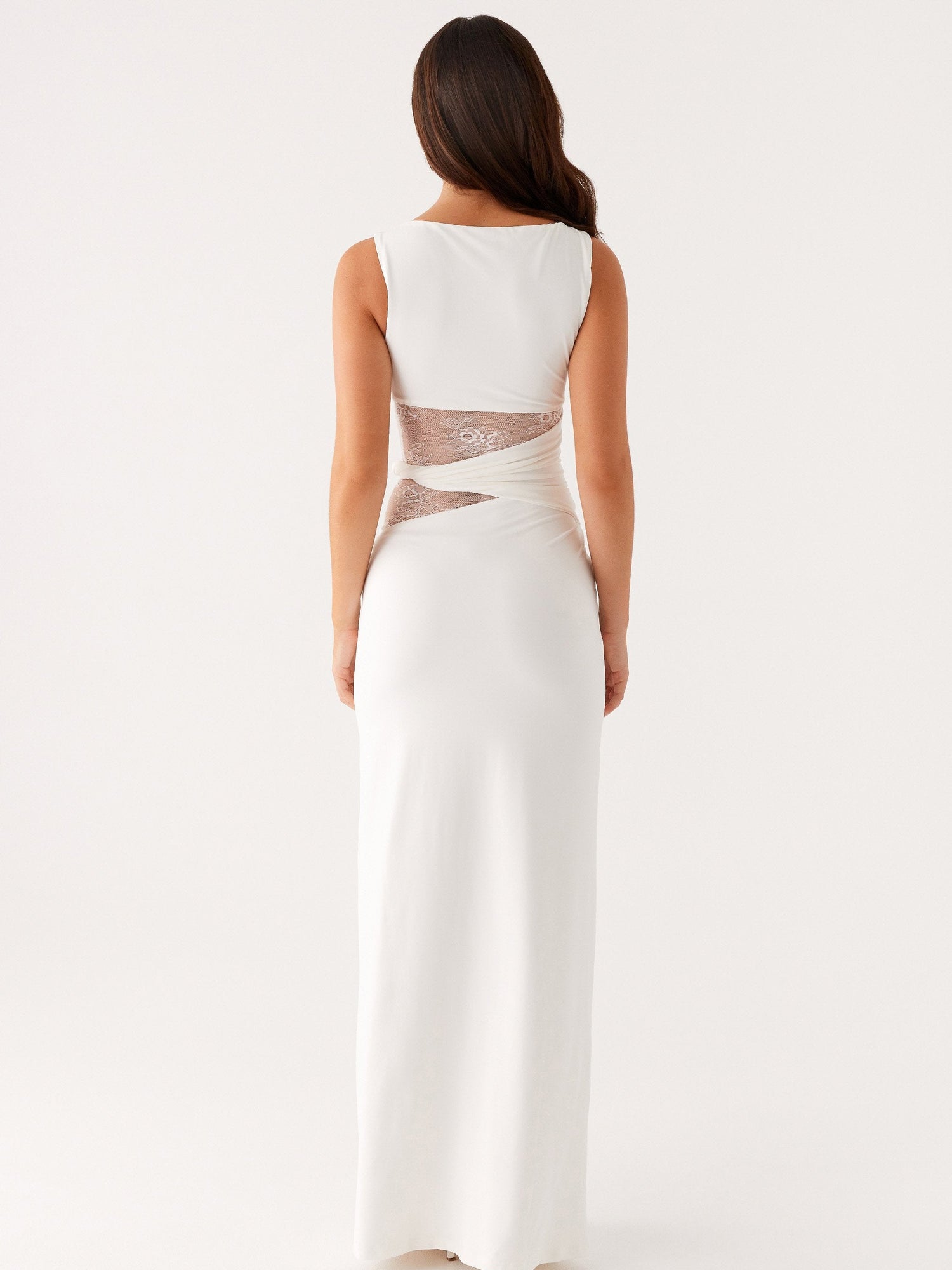 The maxi dress blends sophistication and allure with a touch of modern edge. Designed to elongate the silhouette, it features delicate lace detailing that adds an element of intrigue while maintaining an elegant flow. The fitted bodice transitions seamlessly into a fluid skirt, creating a refined balance between sensual and timeless. Perfect for evening events, formal dinners, or nights out, this piece captures effortless femininity with every movement where confidence meets understated glamour.