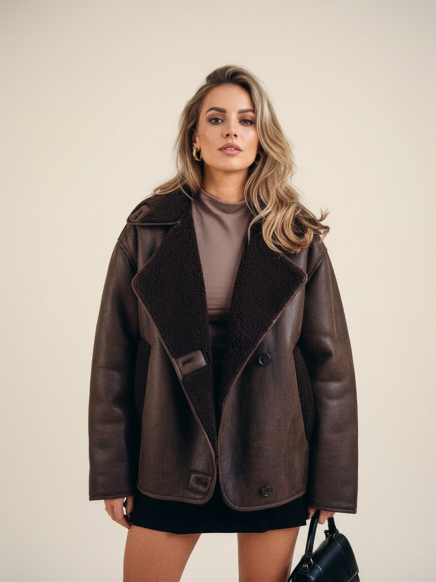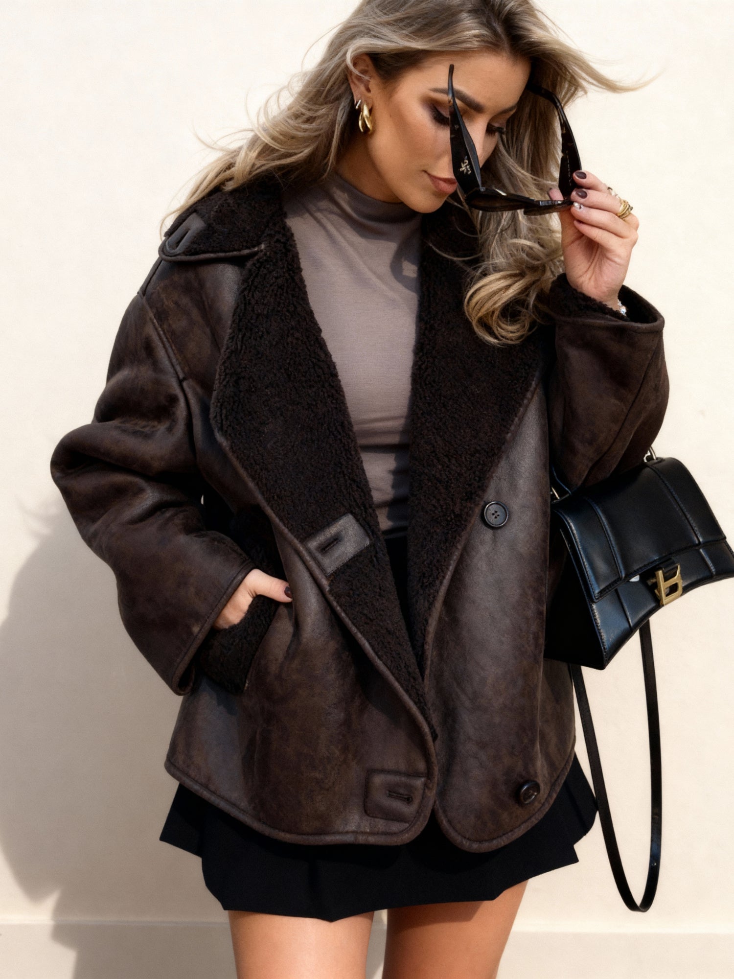 The faux leather jacket captures effortless sophistication with a cozy edge. Lined with soft shearling and finished with structured button details, it offers both warmth and style for the colder seasons. The relaxed yet polished fit makes it a versatile staple — ideal for city strolls, coffee runs, or weekend getaways.