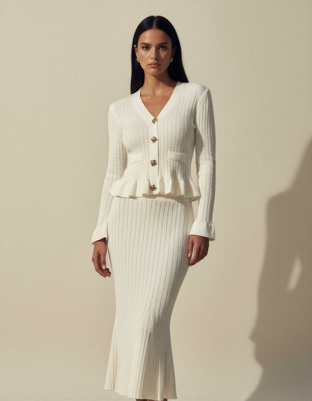 Effortlessly elegant and endlessly versatile — this knit set combines timeless femininity with modern sophistication. The fitted cardigan features subtle ruffles and gold button details, perfectly paired with a matching midi skirt that flows gracefully with every step. Softly structured and beautifully textured, it’s ideal for brunch dates, city strolls, or refined evenings out. A true wardrobe classic that balances comfort and style to perfection.