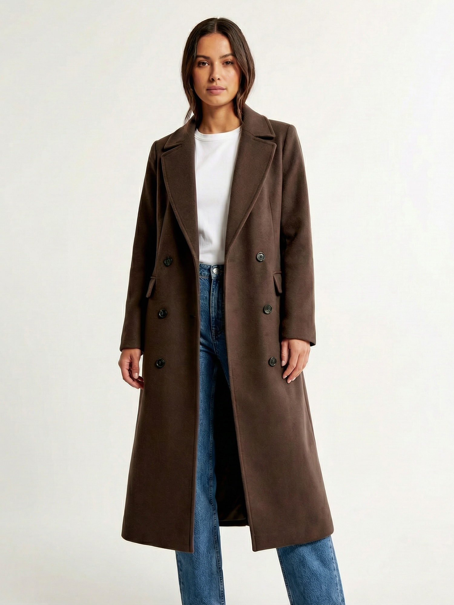 An elevated winter coat designed with a refined double-breasted silhouette and subtle structure for a polished finish. Crafted from a warm wool blend with a smooth lining for comfort, it features a belted waist and sleek lapels for timeless appeal. Perfect for layering over knits or evening wear, this coat brings effortless sophistication to every cold-weather outfit.